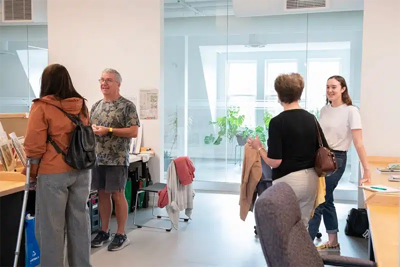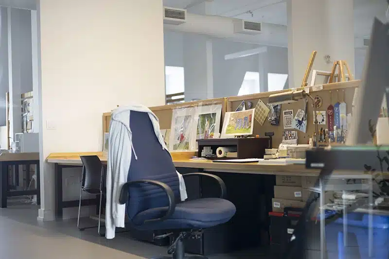 Open Studio is home to a diverse group of writers, textile artists, painters, digital artists, and other Eltuek studio artists. It is designed to be an open space for making, experimenting, and exchanging ideas, with large windows that allow light to enter the rhythm of daily work.