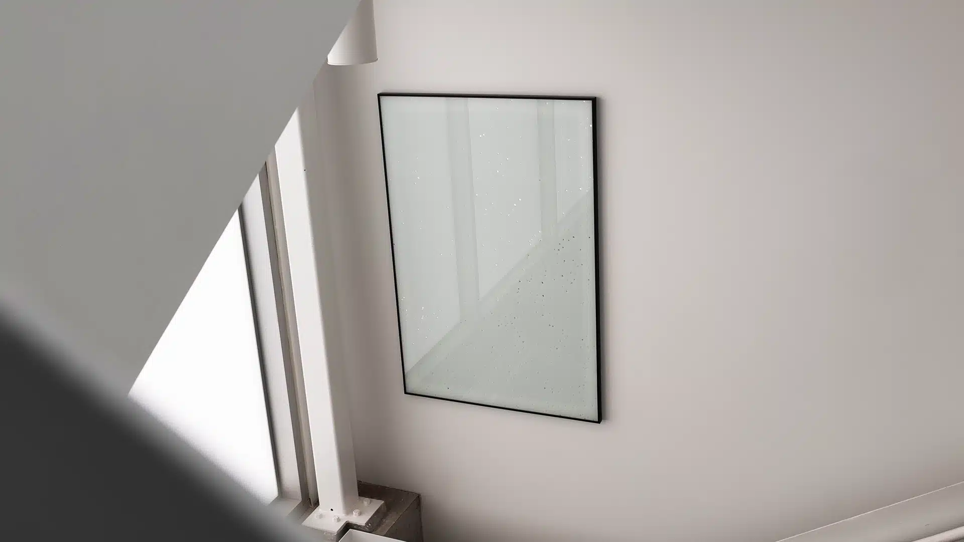 Droplets are two large, custom mirror pieces installed in the South Stairwell extension at Eltuek, catching the viewer mid-ascent. Each is embedded with imagery generated by a simulation of thousands of reflective droplets. As you move past them, your reflection is broken apart into scattered fragments, shifting with each step upward.