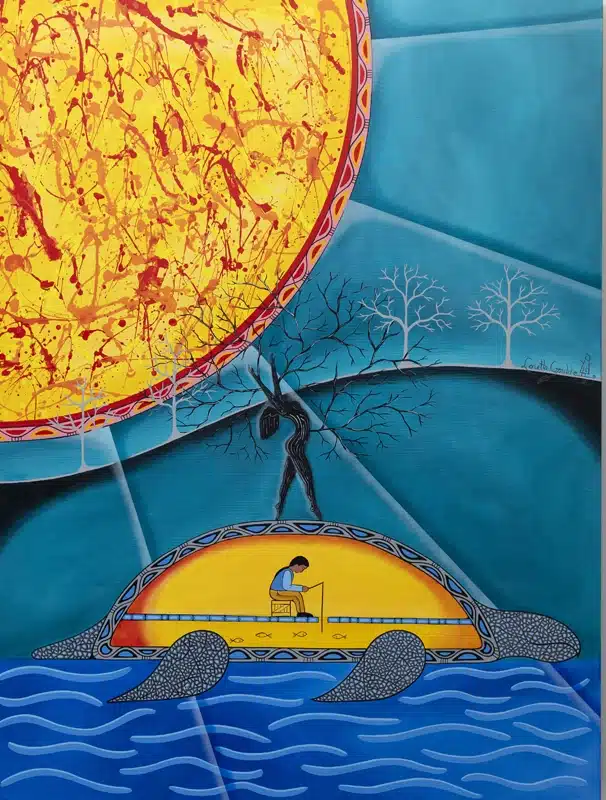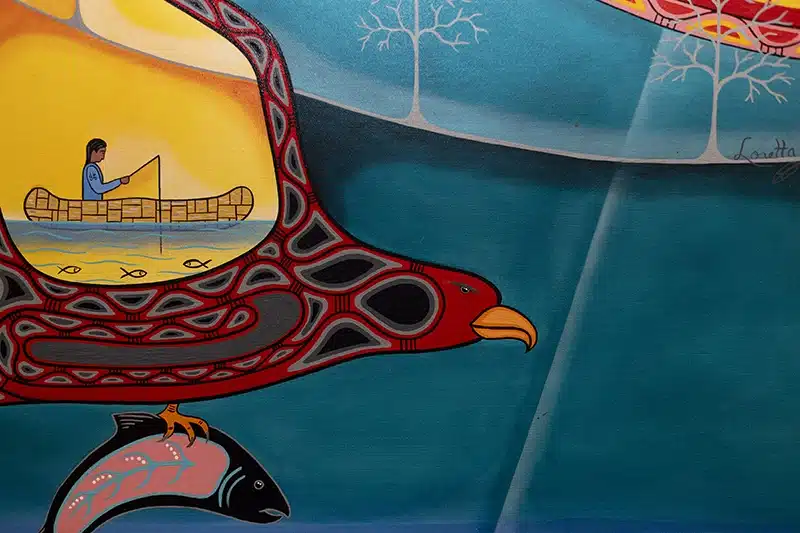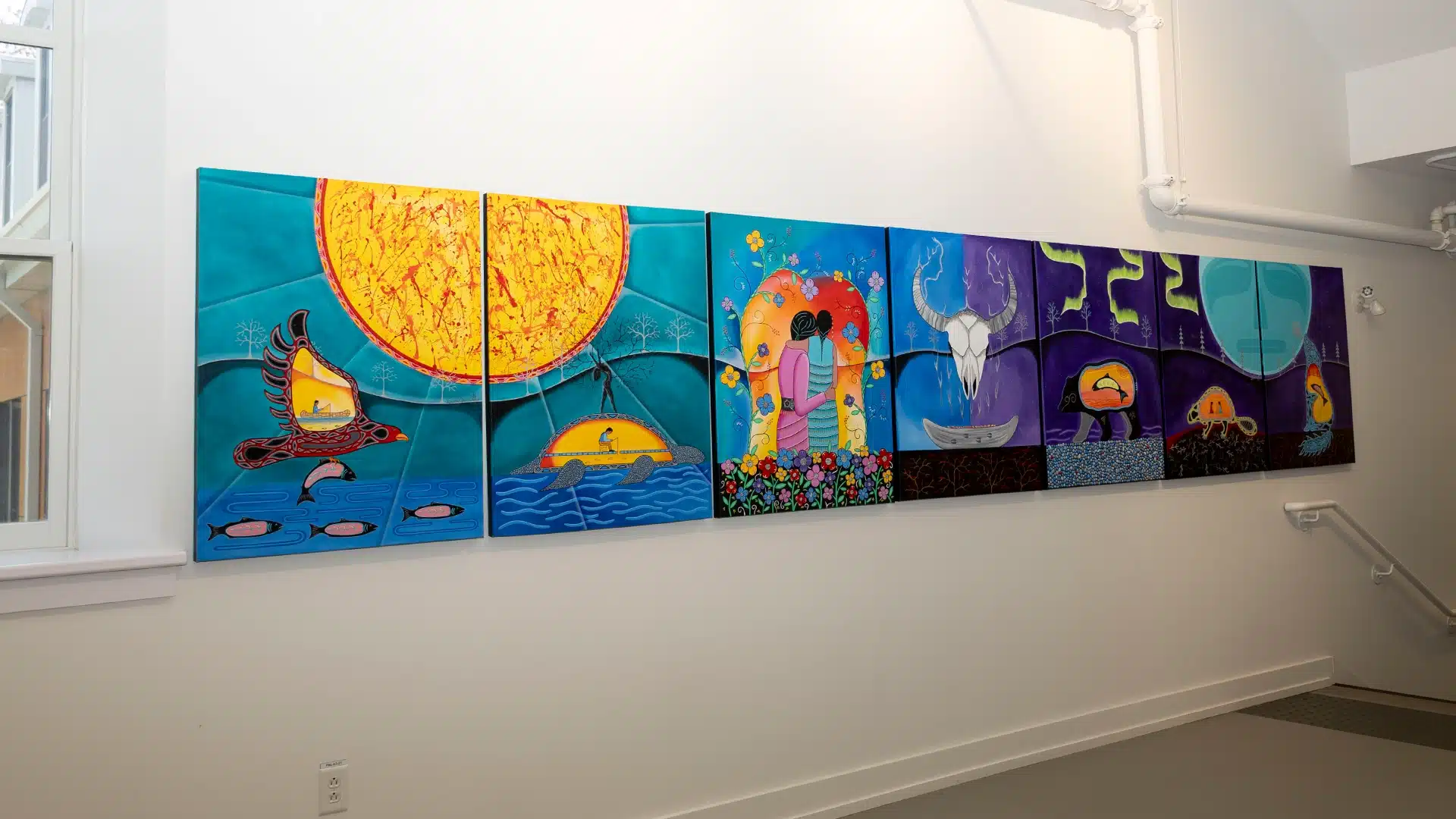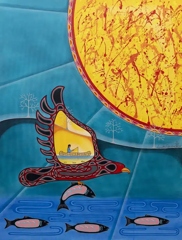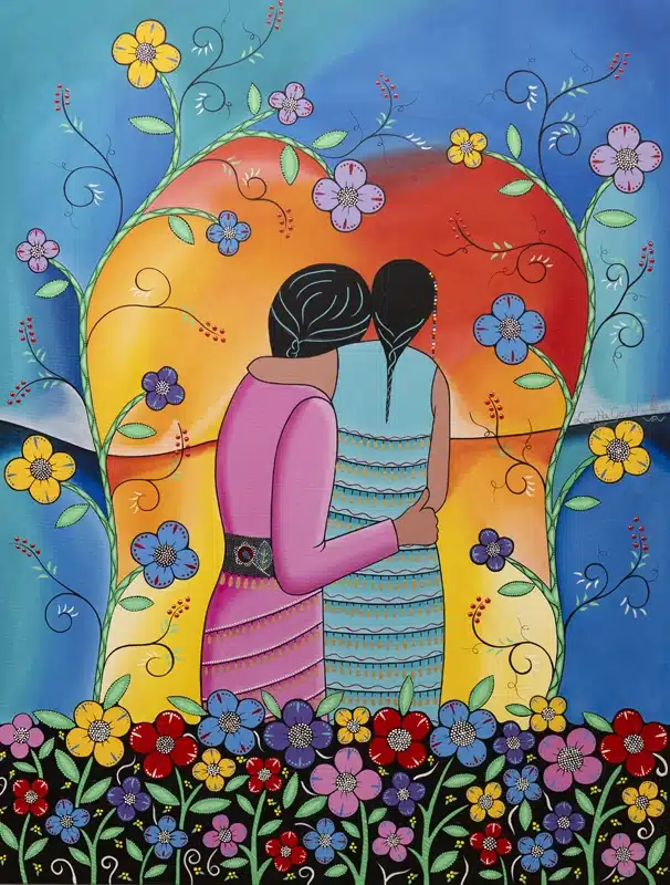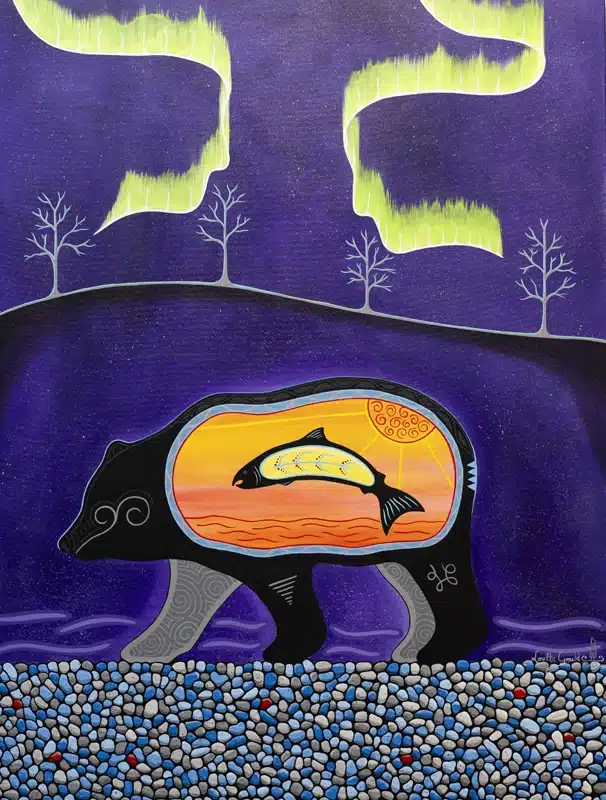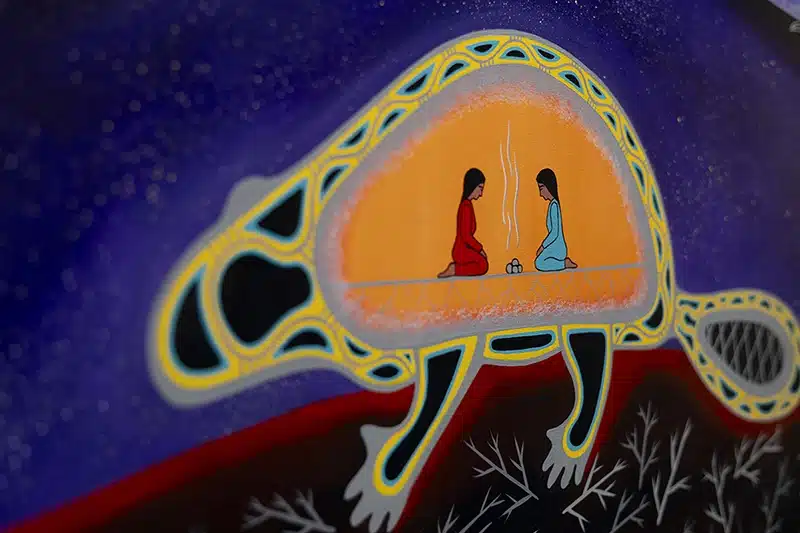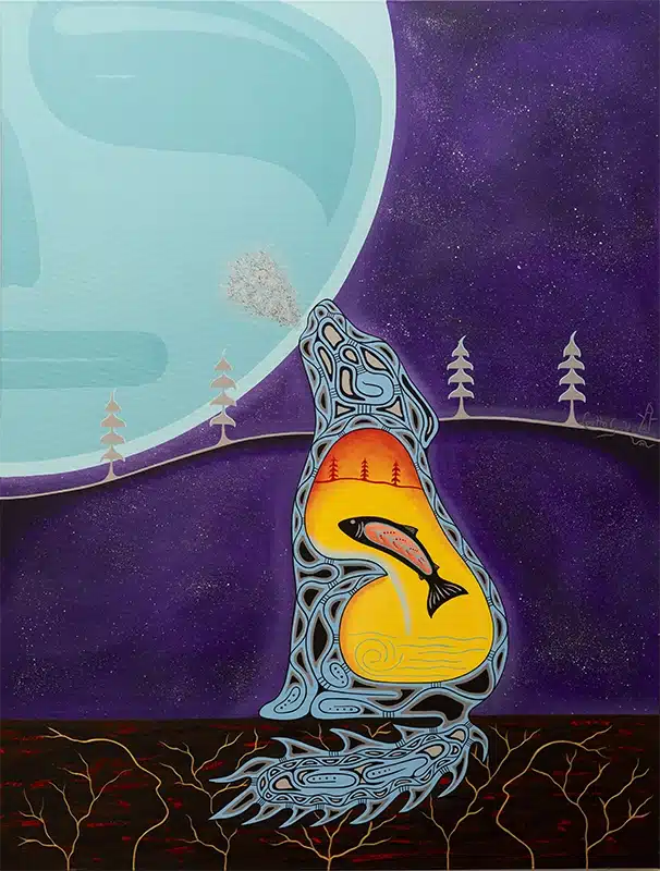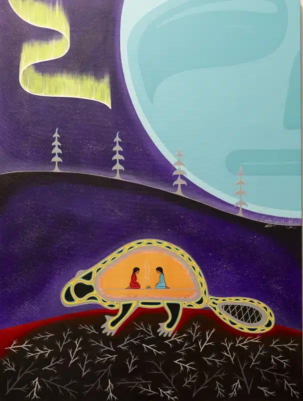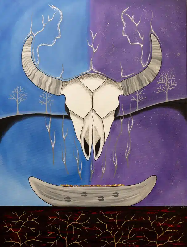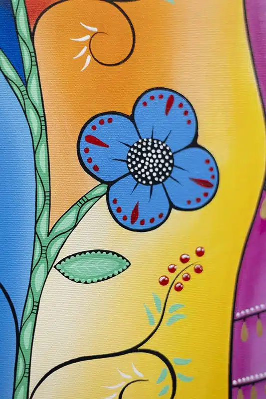 This series features seven paintings inspired by the traditional Seven Teachings of Indigenous Peoples. Gould is a self-taught visual artist from We’koqma’q in Unama’ki. Her work is deeply personal, drawing on her thoughts, feelings, and Mi’kmaw cultural teachings.